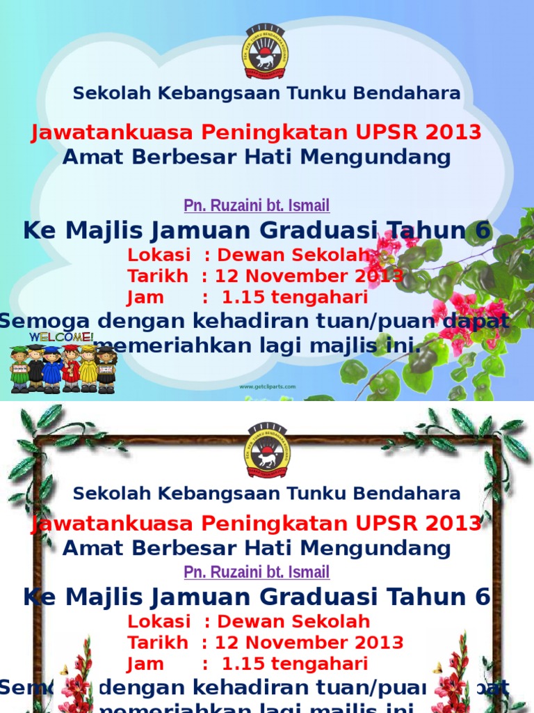 Kenal pasti niat matlamat dan kemampuan anda untuk berumah tangga agar sedikit sebanyak konflik dan masalah dapat dielakkan sejak dari awal. Jawatankuasa Peningkatan UPSR 2013 Amat Berbesar Hati Mengundang Pn. Tuan JEMPUTAN KE MAJLIS GRADUASI SPM 2010 Dengan segala hormatnya perkara di atas adalah dirujuk.
