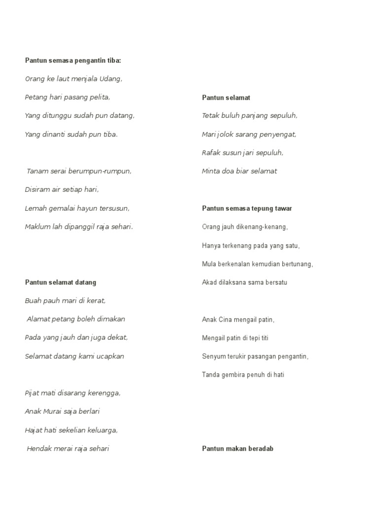 Ya allah berkatilah majlis perkahwinan ini limpahkanlah baraqah dan rahmat kepada kedua mempelai ini nama pengantin dan nama pengantin. PASYSTEMPERKAHWINANCOM - 01162099363 - KUALA LUMPUR SELANGOR PUTRAJAYA - EMCEE KAHWIN KARAOKE PA SYSTEM PERKAHWINAN DEEJAY EMCEE PENGACARA MAJLIS PERKAHWINAN PA SYSTEM KENDURI KAHWIN KERJA KAHWIN AKAD NIKAH VILLA NIKAH DEWAN PERKAHWINAN WEDDING HALL SEWAAN PA SYSTEM. Pantun Gurindam untuk Majlis Rasmi dan Perkahwinan by Abdullah Hassan Aripin Said Ainon Mohd 31 Jan 2005 PTS Publishing House edition Trade Book in Malay Pantun Gurindam untuk Majlis Rasmi dan Perkahwinan 31 Jan 2005 edition Open Library.
